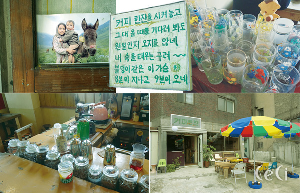 무심하게 쓰인 간판에 반해 안으로 들어서면 각종 재활용품과 어린 시절 장난감을 활용한 독특한 인테리어가 눈에 띈다. 숯불에 구운 원두 덕에 깊고 은은한 맛을 자랑하는 커피도 무척 멋지다.