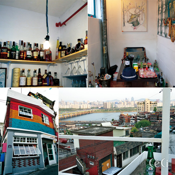 전문 바텐더와 애니메이션 디자이너가 운영하는 콘셉트 바. '길을 잘못 들어섰나' 불안한 마음이 들즈음, 짠하고 나타난다. 무지개떡을 쌓아 올린 듯한 외관, 3층의 건물은 층마다 각각 다른 멋을 풍긴다. 이곳의 히든 플레이스는 3층 옥탑! 한강의 뷰를 만끽할 수 있는 강력 추천 장소인 만큼 예약은 필수다. 옥상에서 '콘크리트 정글 캠핑'의 맛을 느낄 수 있으니 참고하시길.